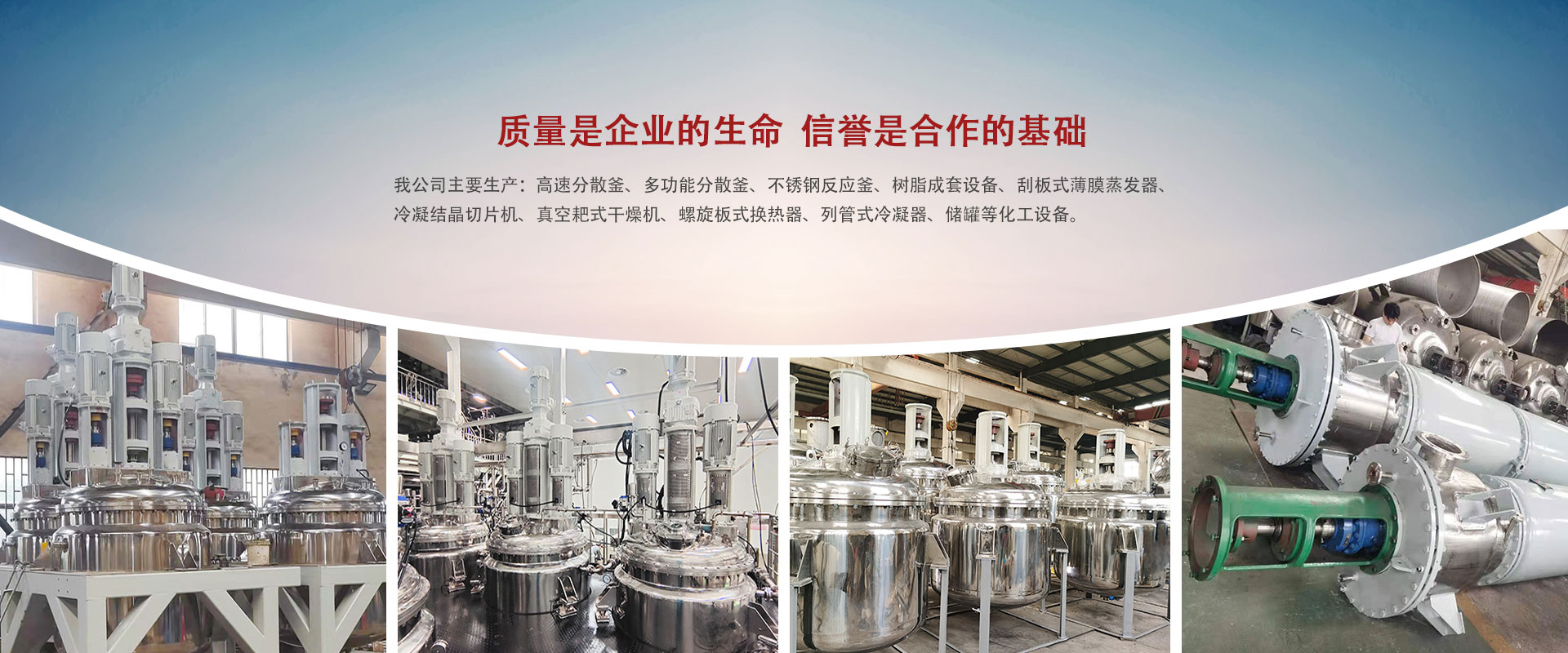 我公司主要生產:高速分散釜、多功能分散釜、不銹鋼反應釜、樹脂成套設備、刮板式薄膜蒸發器、冷凝結晶切片機、真空耙式干燥機、螺旋板式換熱器、列管式冷凝器、儲罐等化工設備。